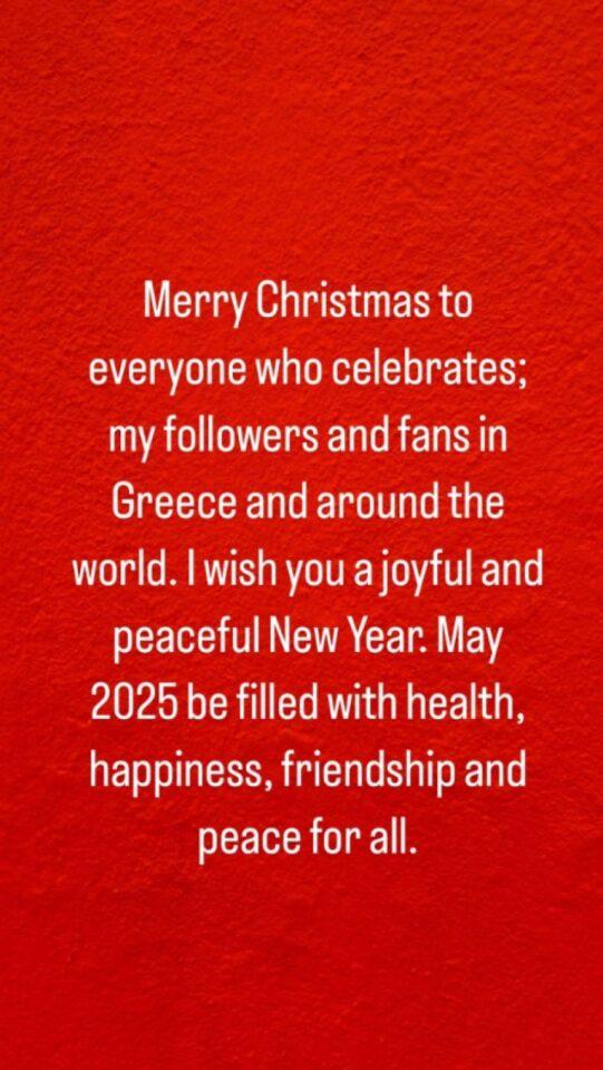«Καλά Χριστούγεννα σε όλους που γιορτάζουν: Τους ακόλουθούς μου και τους οπαδούς στην Ελλάδα και σε όλο τον κόσμο. Σας εύχομαι μία χαρούμενη και ειρηνική νέα χρονιά. Μακάρι το 2025 να είναι γεμάτο υγεία, χαρά, φιλία και ειρήνη για όλους».