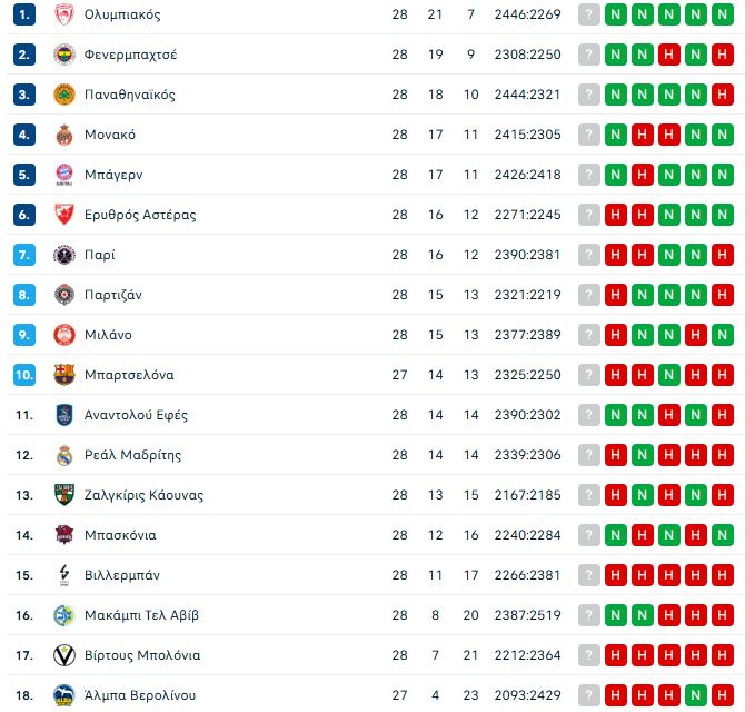EuroLeague: Η βαθμολογία μετά τη νίκη του Ολυμπιακού επί της Παρτιζάν