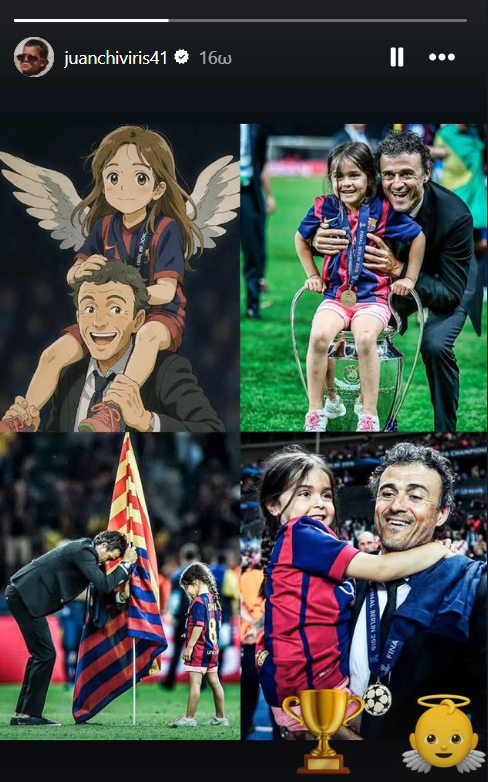 Ο φόργουορντ του Παναθηναϊκού AKTOR,Χουάντσο Ερνανγκόμεθ ανέβασε στα stories του στο Instagram μία σύνθεση με 4 φωτογραφίες που κυκλοφορούν, όπου ο Λουίς Ενρίκε είναι με την κόρη του, συνοδεύοντάς την με τα emojis ενός τροπαίου και ενός αγγέλου.