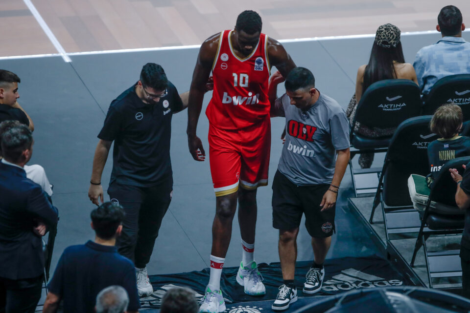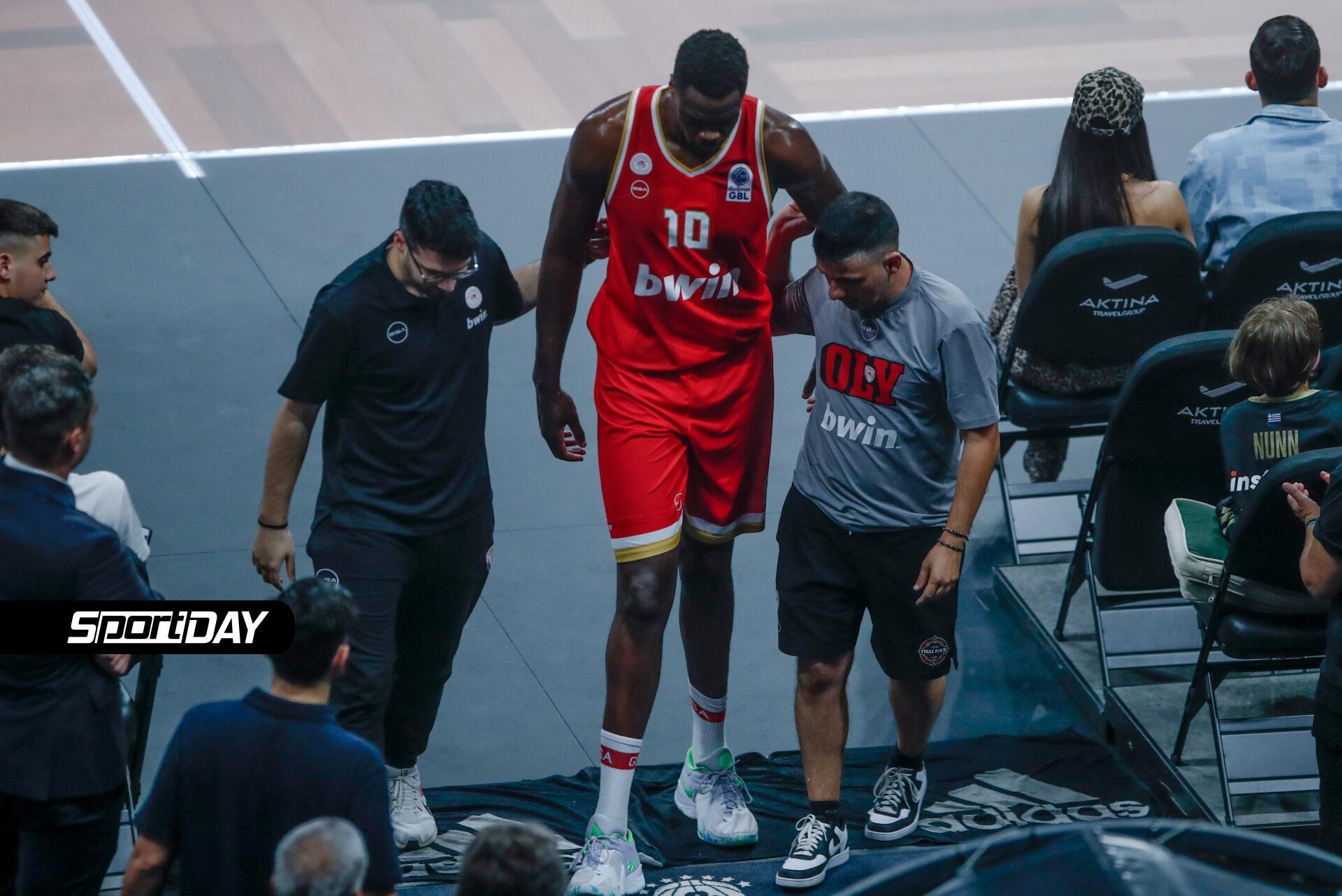 Ο Γάλλος σέντερ τραυματίστηκε στο γόνατο και οδηγήθηκε στα αποδυτήρια, με την ΕΡΤ να μεταδίδει πως στη συνέχεια αποχώρησε από το ΟΑΚΑ για να υποβληθεί σε ιατρικές εξετάσεις.