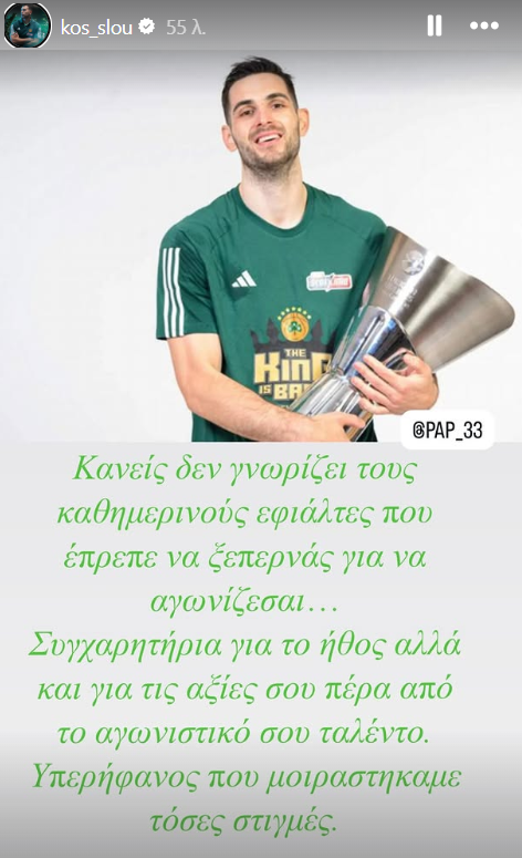 Ο αρχηγός του Παναθηναϊκού, Κώστας Σλούκας, κοινοποίησε ένα συγκλονιστικό μήνυμα προς τον φίλο και συμπαίκτη του, Ιωάννη Παπαπέτρου, ο οποίος ανακοίνωσε πως αποχωρεί από το μπάσκετ.