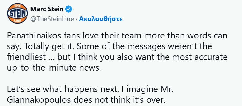 Ο έγκυρος Αμερικανός δημοσιογράφος, Μαρκ Στάιν, με μήνυμά του στα σόσιαλ μίντια αναφέρθηκε στην υπόθεση, αλλά και στα μηνύματα που δέχεται από φίλους του Παναθηναϊκού. Όπως τόνισε, πιστεύει ότι ο Δημήτρης Γιαννακόπουλος δεν θα παρατήσει την υπόθεση.
