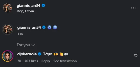 Ο Νόλε, μάλιστα, φαίνεται πως υποστηρίζει τη γαλανόλευκη και στο Eurobasket μετά τον αποκλεισμό της Σερβίας. Κάτω από το ποστ του Γιάννη Αντετοκούνμπο, σχολίασε στα ελληνικά «Πάμε», μαζί με μία ελληνική σημαία!
