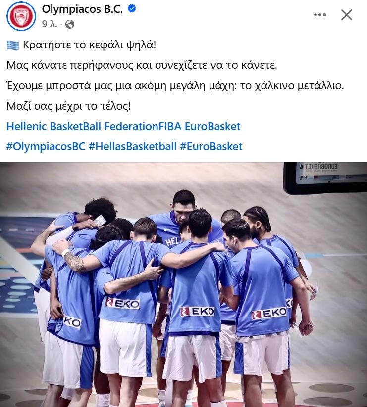 Η αντίδραση της «ερυθρόλευκης» ΚΑΕ μετά την ήττα της Εθνικής μπάσκετ και τον αποκλεισμό από τον τελικό του Ευρωμπάσκετ.