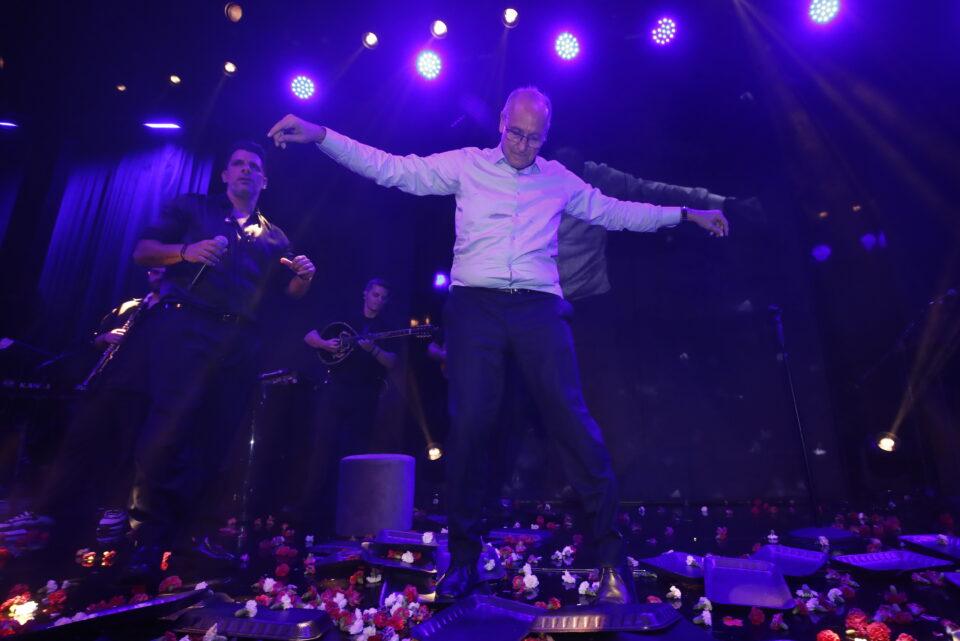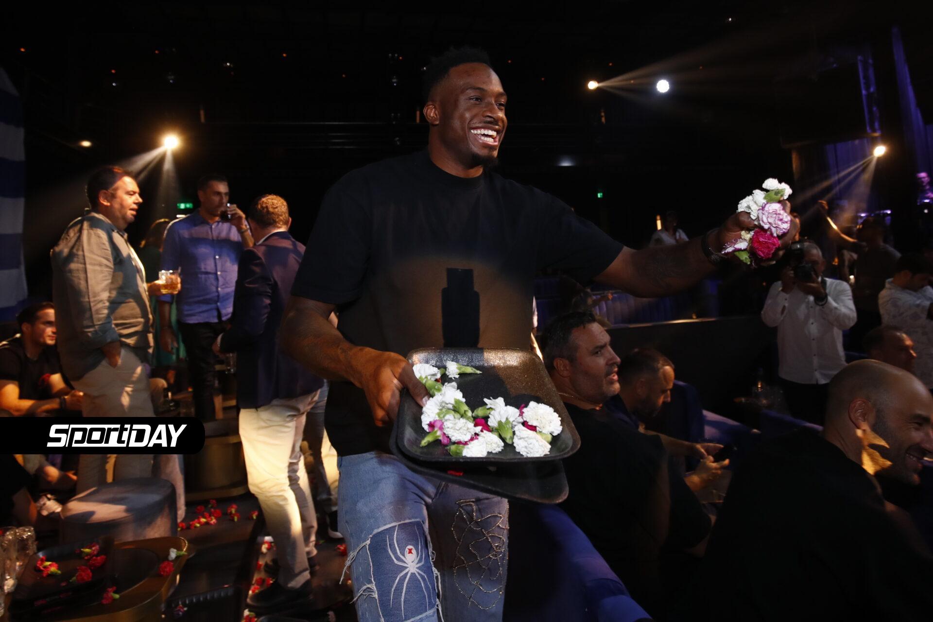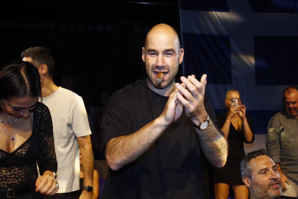 Ο Βασίλης Σπανούλης δεν ξέφυγε από την παράδοση: άναψε το πούρο του, το χαρακτηριστικό «σήμα» πρωταγωνιστών σε τέτοιες στιγμές. Στο πλευρό του, όπως πάντα, η σύζυγός του, Ολυμπία Χοψονίδου. Οσο για το μικρόφωνο; Το πήρε ο Γιαννούλης Λαραντζάκης.