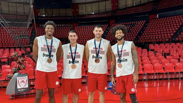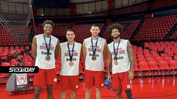 Αντετοκούνμπο, Λαρεντζάκης, Παπανικολάου και Ντόρσεϊ έδωσαν το παρών στην προπόνηση του Ολυμπιακού και φωτογραφήθηκαν με τα μετάλλια που κατέκτησαν με την εθνική ομάδα στο πρόσφατο Eurobasket.