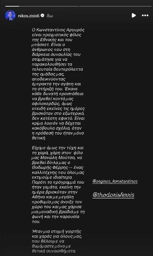 «Ο Κωνσταντίνος Αργυρός είναι πραγματικός φίλος της Εθνικής και του μπάσκετ. Είναι ο άνθρωπος που στη διάρκεια συναυλίας του σταμάτησε για να παρακολουθήσει τα τελευταία δευτερόλεπτα της ομάδας μας, αποδεικνύοντας έμπρακτα την αγάπη και τη στήριξή του. Έκανε κάθε δυνατή προσπάθεια να βρεθεί κοντά μας αφιλοκερδώς, όμως επειδή εκείνες τις ημέρες βρισκόταν στο εξωτερικό, δεν κατέστη εφικτό. Είναι κρίμα λοιπόν να δέχεται κακόβουλα σχόλια, όταν η πρόθεσή του ήταν μόνο θετική.