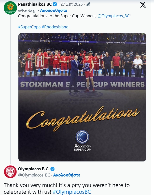 Θυμίζουμε πως οι «πράσινοι» έδωσαν συγχαρητήρια, μέσω σόσιαλ μίντια, στον Ολυμπιακό και οι Πειραιώτες απάντησαν λίγο μετά, κι αυτοί μέσω των σόσιαλ μίντια: