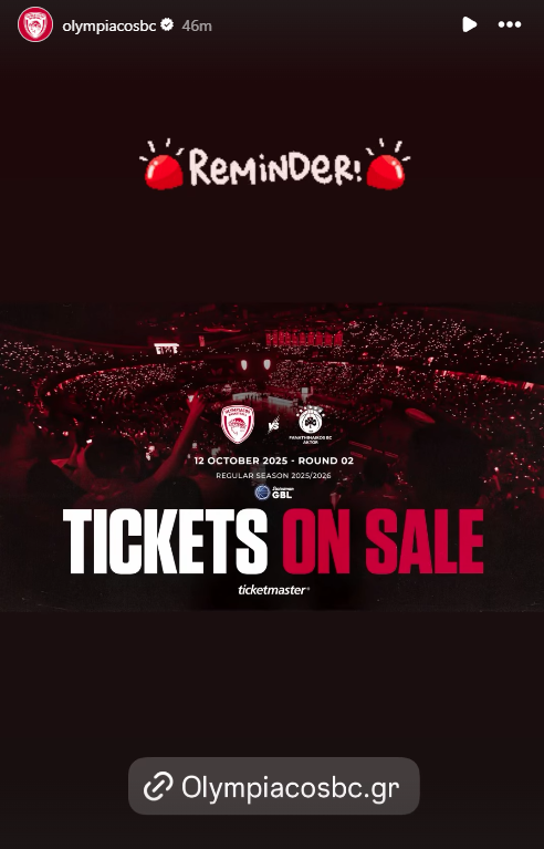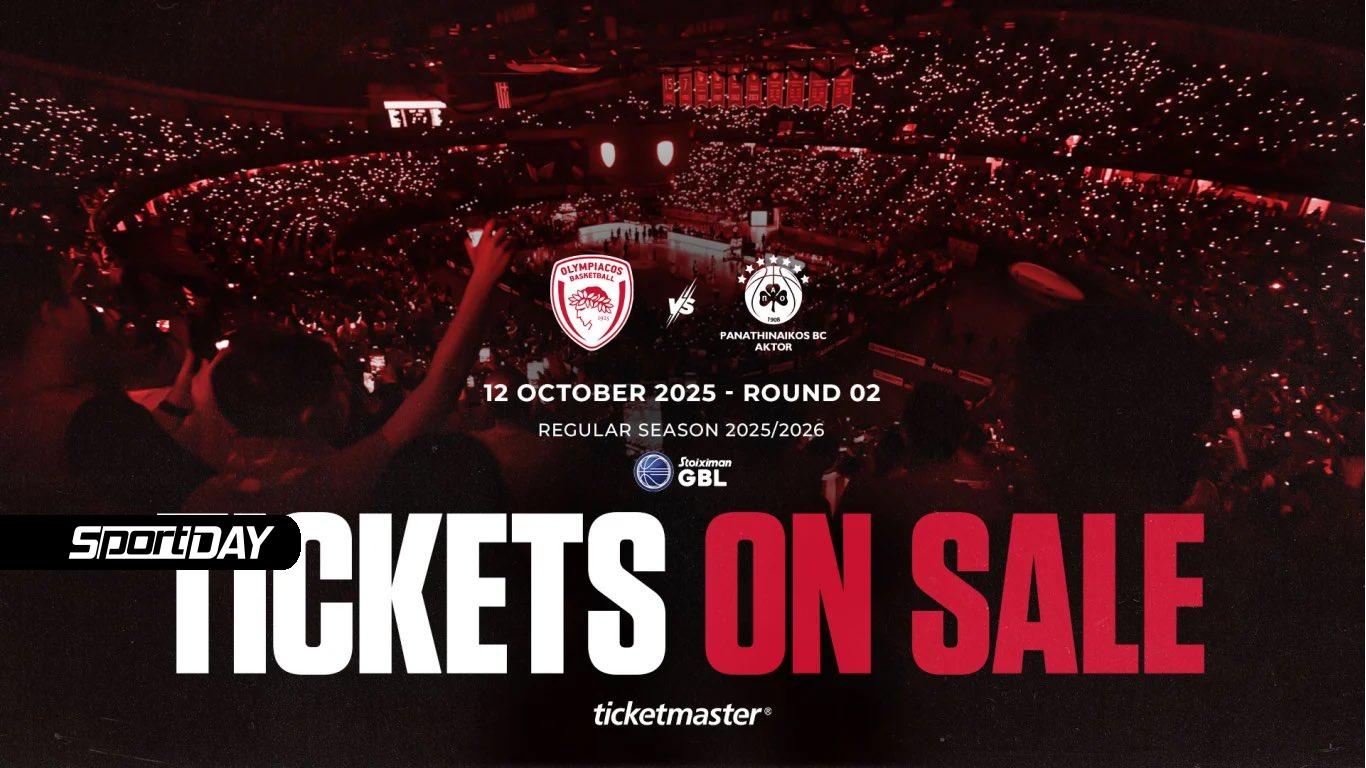 Ο Ολυμπιακός αντιμετωπίζει τον Παναθηναϊκό AKTOR στο πλαίσιο της δεύτερης αγωνιστικής της Stoiximan GBL (12/10, 19:00) και η ερυθρόλευκη ΚΑΕ υπενθύμισε πως σήμερα τίθενται σε κυκλοφορία τα εισιτήρια του μεγάλου αγώνα.