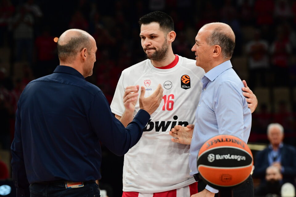 Οι Παναγιώτης και Γιώργος Αγγελόπουλος βράβευσαν τον Κώστα Παπανικολάου πριν από το τζάμπολ του αγώνα του Ολυμπιακού με την Dubai BC, στο πλαίσιο της 3ης αγωνιστικής της EuroLeague.