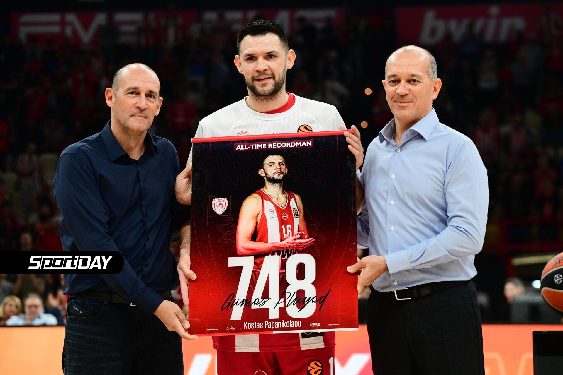 Λίγο πριν το τζάμπολ του αγώνα με την Dubai BC, οι πρόεδροι του Ολυμπιακού βράβευσαν τον Κώστα Παπανικολάου, ο οποίος έγινε ο πρώτος σε συμμετοχές στην ιστορία των “ερυθρόλευκων”.