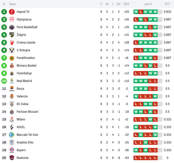 Αυτή είναι η βαθμολογία της EuroLeague μετά την 6η αγωνιστική.