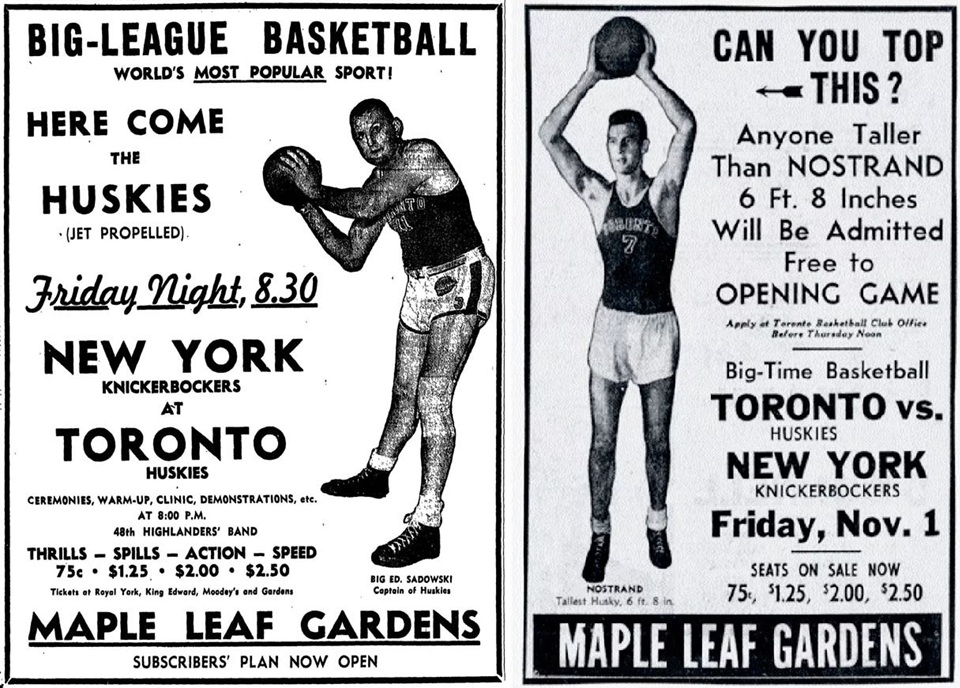 Δύο διαφημιστικές καταχωρίσεις για τον παρθενικό αγώνα του ΒΑΑ, που διεξήχθη στο «Maple Leaf Gardens» του Τορόντο την 1η Νοεμβρίου 1946. Προσέξτε αυτό που είναι δεξιά: οι διοργανωτές πρόσφεραν δωρεάν είσοδο σε όποιον θεατή βρισκόταν να είναι ψηλότερος από τον Τζορτζ Νόστραντ των Χάσκις (ο οποίος έβλεπε τον κόσμο από τα 2.03 μ.)!