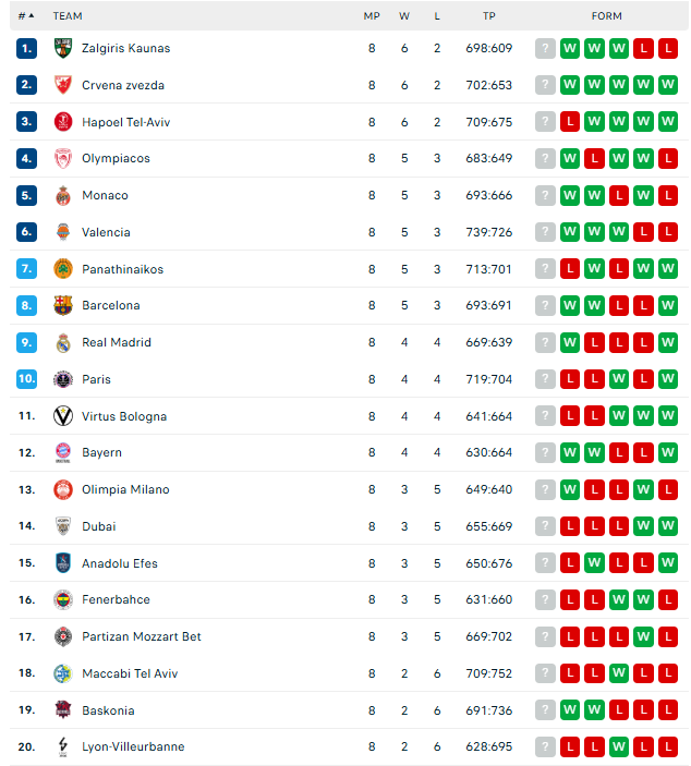 Πια οι Ισραηλινοί είναι στο… πρώτο σκαλί, αλλά σε ισοβαθμία, ενώ ο Ολυμπιακός είναι στο δεύτερο με ρεκόρ 5-3.