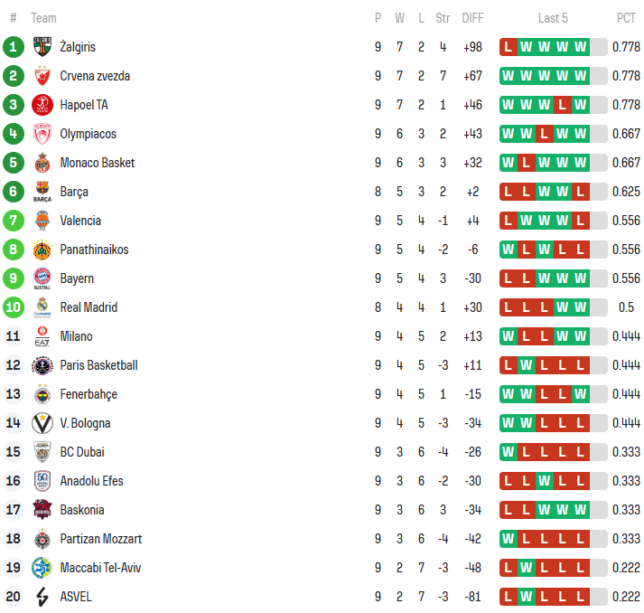 EuroLeague Βαθμολογία: Ανέβηκε ο Ολυμπιακός με τη νίκη επί της Παρτιζάν