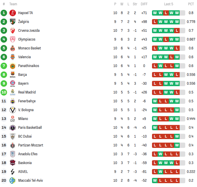 EuroLeague: Η βαθμολογία μετά τη μεγάλη νίκη του Παναθηναϊκού στο Παρίσι