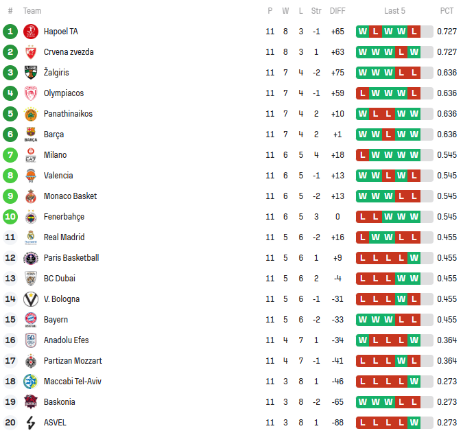 EuroLeague Βαθμολογία: Ο Ολυμπιακός έχασε την ευκαιρία στο Μιλάνο