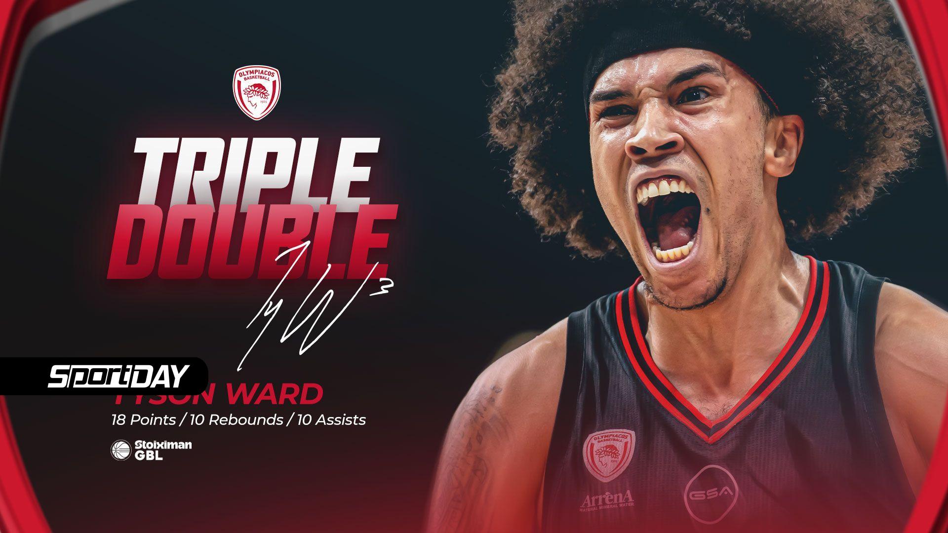 Ο Τάισον Γουόρντ πραγματοποίησε μια τρομερή εμφάνιση έχοντας 18 πόντους, 10 ριμπάουντ και 10 ασίστ και έγινε ο τρίτος παίκτης στην ιστορία του Ολυμπιακού, που πέτυχε triple-double σε αγώνα ελληνικού πρωταθλήματος.