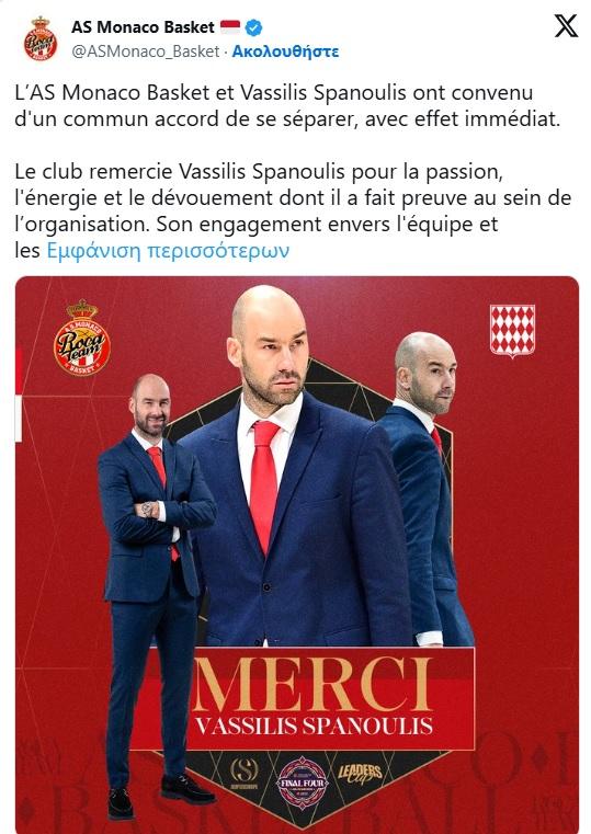 Η Moνακό και ο Βασίλης Σπανούλης συμφώνησαν κοινή συναινέσει να χωρίσουν τους δρόμους τους, με άμεση ισχύ. Ο σύλλογος ευχαριστεί τον Σπανούλη για το πάθος, την ενέργεια και την αφοσίωσή του στον οργανισμό. Η δέσμευσή του στην ομάδα και στις αξίες του συλλόγου θα παραμείνει ένα πολύτιμο κομμάτι της ιστορίας της Μονακό.