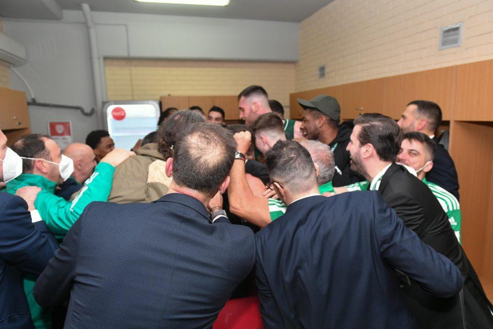 Στιγμές από το πάρτι που έστησαν οι παίκτες του «τριφυλλιού» στα αποδυτήρια του ΣΕΦ μετά το μεγάλο διπλό επί του Ολυμπιακού με 81-76.