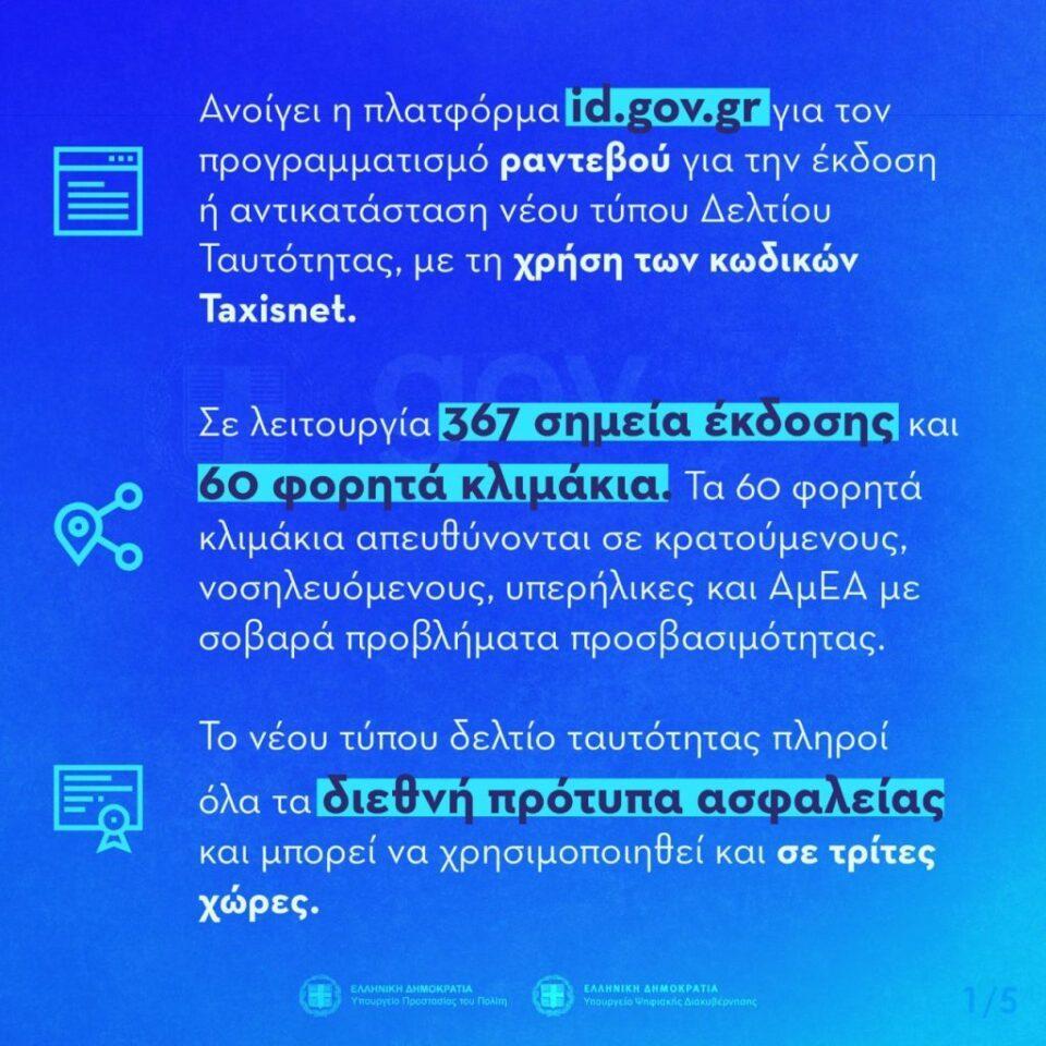Σήμερα από τις 08:30 ξεκινά η λειτουργία της πλατφόρμας id.gov.gr. Με τον τρόπο αυτό οι πολίτες έχουν τη δυνατότητα να προγραμματίζουν ψηφιακά τα ραντεβού τους, με τη διαθεσιμότητα να ξεκινά από την Τρίτη 26/9/23, για την έκδοση νέου τύπου ταυτοτήτων ή την αντικατάστασή τους λόγω μεταβολής των στοιχείων, λήξης ισχύος, φθοράς ή παλαιότητας σύμφωνα με τα όσα ορίζονται στην κοινή υπουργική απόφαση (ΦΕΚ: Β’5619) των υπουργών Ψηφιακής Διακυβέρνησης Δημήτρη Παπαστεργίου και Προστασίας του Πολίτη Γιάννη Οικονόμου.