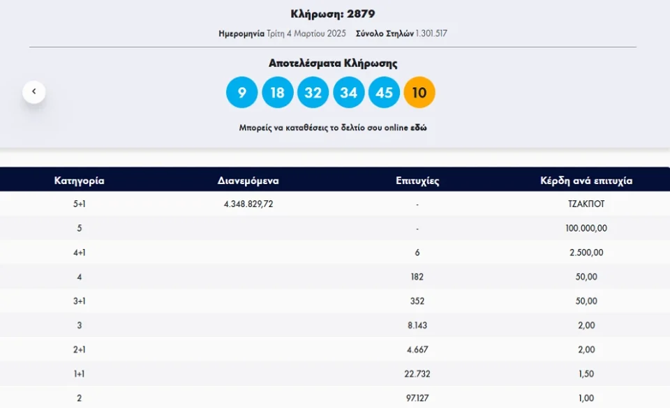 Τα αποτελέσματα της κλήρωσης 2879.
