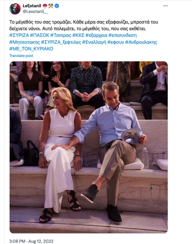 Επιπλέον, πρόκειται για το πρόσωπο που φέρεται να βρίσκεται πίσω από τον λογαριασμό Lexotanil στο Χ έναν αρκετά δραστήριο ανώνυμο λογαριασμό που τον τελευταίο καιρό έχει διασπείρει πλήθος ψευδών και συκοφαντικών πληροφοριών και κατά συγγενών θυμάτων των Τεμπών, υποστηρίζει με ζέση τη ΝΔ και τον Κυριάκο Μητσοτάκη και αναπαράγει τακτικά περιεχόμενο της Ομάδας Αλήθειας και της ιστοσελίδας Ellada24.gr.