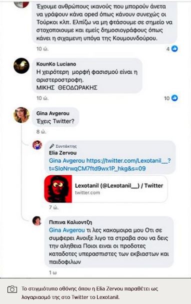 Σε στιγμιότυπο οθόνης με ημερομηνία 14 Αυγούστου 2022, που μοιράστηκε μαζί μας η βουλεύτρια του ΣΥΡΙΖΑ Έλενα Ακρίτα (που έχει αντιδικήσει με τη Ζερβού στο παρελθόν και έχει κερδίσει αγωγή σε βάρος της για επώνυμες αναρτήσεις της στο facebook), η Έλια Ζερβού εμφανίζεται να απαντά σε χρήστρια του facebook που τη ρωτά –κάτω από ανάρτησή της– αν έχει twitter, δίνοντας το λινκ του επίμαχου λογαριασμού Lexotanil.