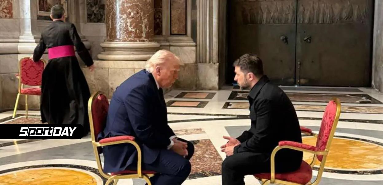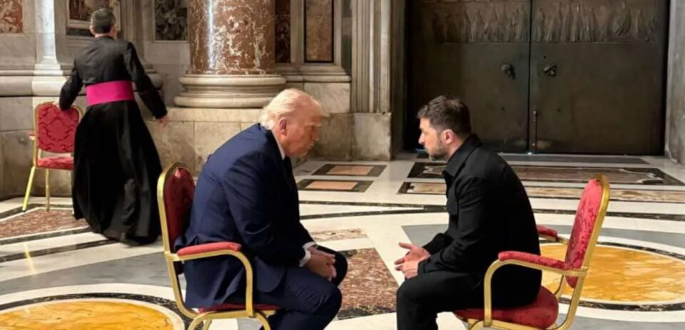 Μέσα στη βαριά ατμόσφαιρα πένθους για τον θάνατο του Πάπα, στο εσωτερικό της βασιλικής του Αγίου Πέτρου, δύο ηγέτες που διαμορφώνουν σήμερα την παγκόσμια πραγματικότητα κάθονταν αντικριστά, κάτω από έναν τεράστιο πίνακα της Βάπτισης του Ιησού: ο Ντόναλντ Τραμπ και ο Βολοντίμιρ Ζελένσκι.