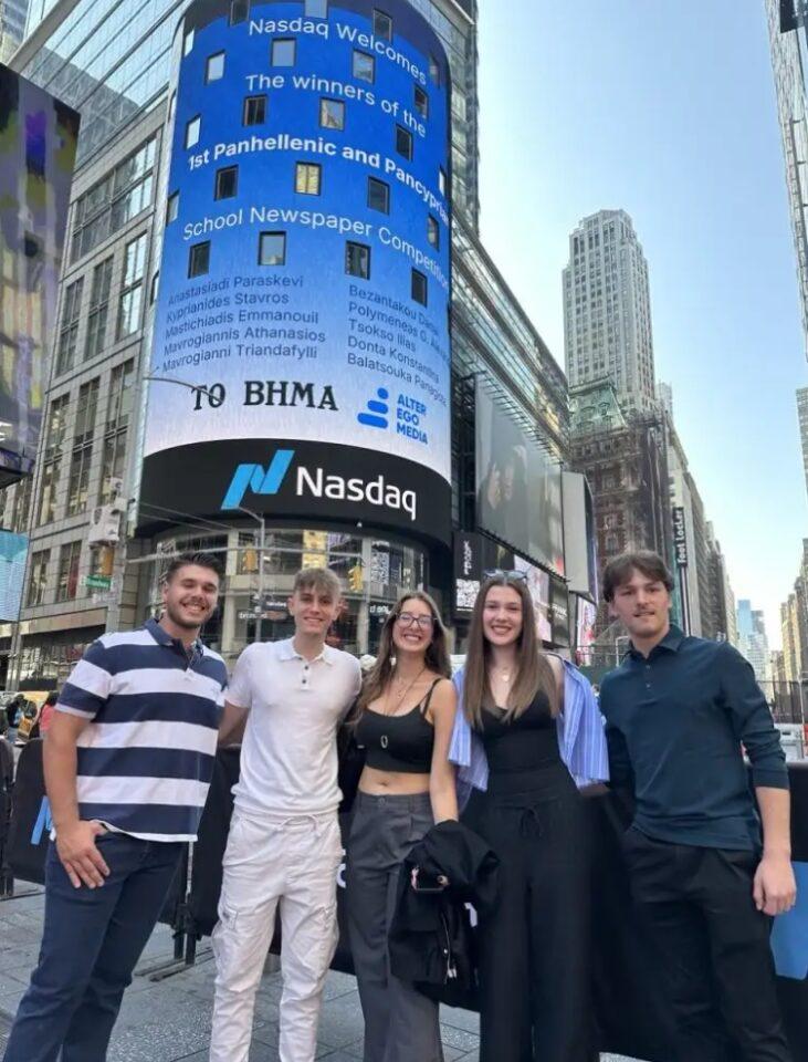 Η κορυφαία στιγμή του ταξιδιού, όμως, ήταν η απρόσμενη έκπληξη που περίμενε τους μαθητές στην Times Square. Στην πρόσοψη του κτιρίου του Nasdaq, σε ένα από τα πιο εμβληματικά σημεία του πλανήτη, προβλήθηκε το μήνυμα καλωσορίσματος και τα ονόματά τους.