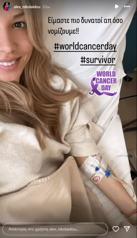 Η χθεσινή ημέρα, Τρίτη 4 Ιανουαρίου, ήταν αφιερωμένη στην Παγκόσμια Ημέρα Κατά του Καρκίνου. Με αφορμή αυτήν τη σημαντική ημέρα, η Αλεξάνδρα Νικολαΐδου, σύντροφος του Ντέμη Νικολαΐδη, μοιράστηκε για πρώτη φορά τη δική της προσωπική μάχη με την ασθένεια μέσω μιας ανάρτησης στο Instagram.