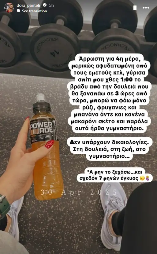 «Άρρωστη για 4η μέρα, μερικώς αφυδατωμένη από τους εμετούς κτλ, γύρισα σπίτι μου χθες 1:00 το βράδυ από τη δουλειά που θα ξαναπάω σε 3 ώρες από τώρα, μπορώ να φάω μόνο ρύζι, φρυγανιές και μπανάνα, άντε και κανένα μακαρόνι σκέτο και παρόλα αυτά ήρθα γυμναστήριο. Δεν υπάρχουν δικαιολογίες. Στη δουλειά, στη ζωή, στο γυμναστήριο. Α, μην το ξεχάσω και σχεδόν 7 μηνών έγκυος», έγραψε.