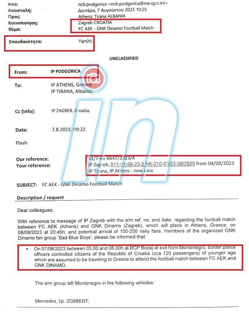 Έγγραφο που αποκαλύπτει το «in.gr» αναφέρει πως από το πρωί της Δευτέρας (7/8) οι αρχές του Μαυροβουνίου είχαν ενημερώσει τις αντίστοιχες ελληνικές αναφορικά με το κονβόι των 150-200 Κροατών χούλιγκαν που προκάλεσαν το μακελειό στη Νέα Φιλαδέλφεια, το οποίο όμως δεν μπόρεσε να αποτρέψει η ΕΛΑΣ.