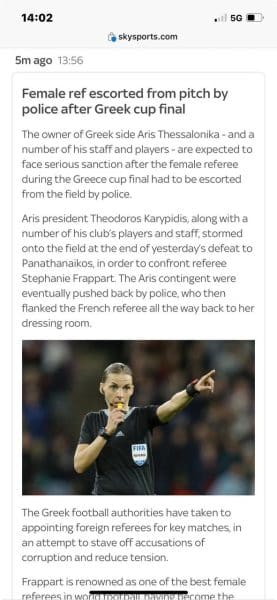 «Η Στεφανί Φραπάρ φυγαδεύτηκε από τον αγωνιστικό χώρο από την αστυνομία, μετά την ολοκλήρωση του τελικού του ελληνικού Κυπέλλου» αναφέρει το «Skysports», που τονίζει την άνανδρη επίθεση του Θεόδωρου Καρυπίδη.