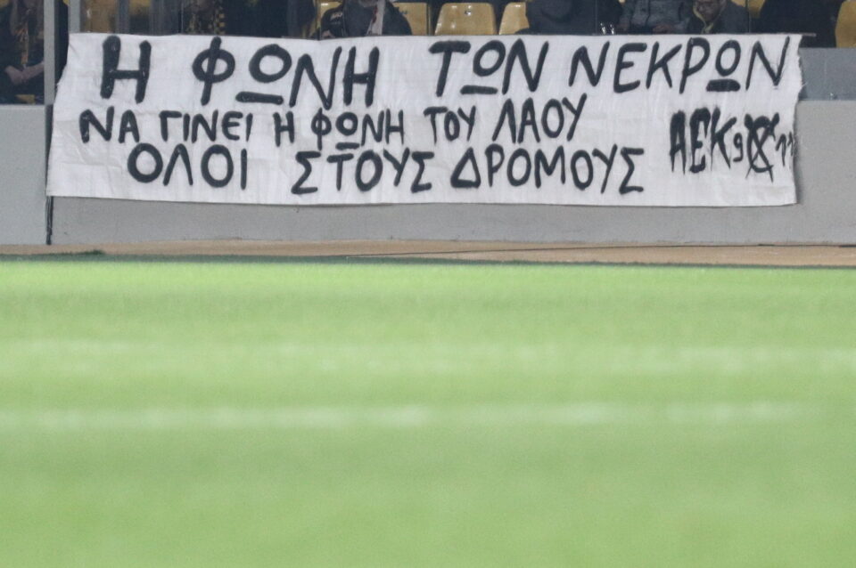 Πανό των φίλων της ΑΕΚ σχετικά με τις κινητοποιήσεις της Κυριακής για την τραγωδία των Τεμπών.