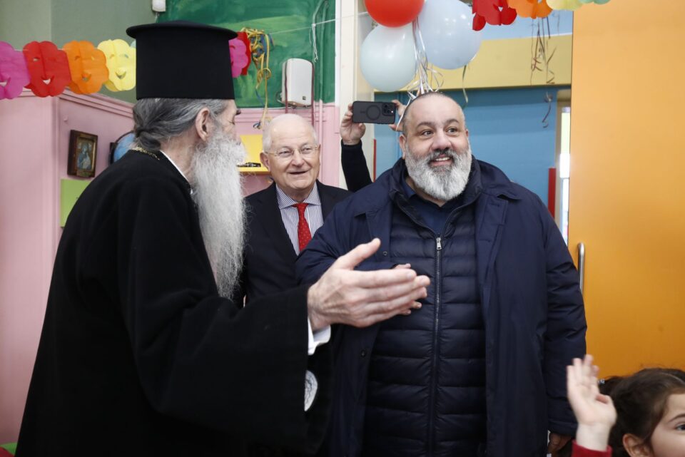 Ο Μητροπολίτης Πειραιά, Σεραφείμ τους ξενάγησε στις μαθητικές αίθουσες των εκπαιδευτηρίων, ενώ στη συνέχεια όλοι μαζί βρέθηκαν δίπλα στα παιδιά. Παράλληλα, ο Λεόνε μοίρασε «ερυθρόλευκα» δώρα σε όλους τους μικρούς μαθητές.