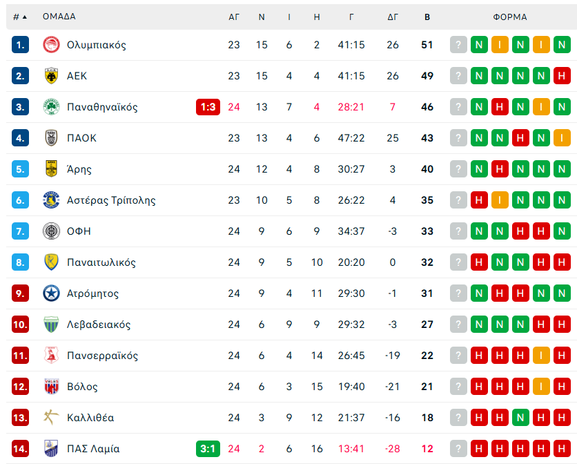 Super League: Η βαθμολογία μετά την τεράστια γκέλα του Παναθηναϊκού