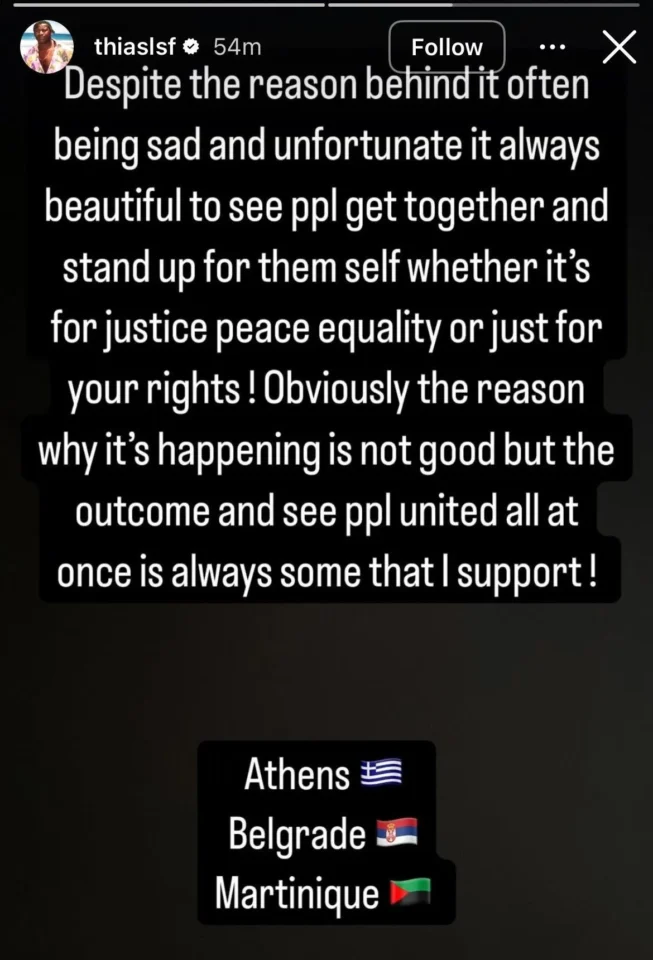 Παρότι ξένος, ο Ματίας Λεσόρ μίλησε. Αλλωστε ανέκαθεν ο Γάλλος ήταν κατά της… σιωπής. «Παρόλο που ο λόγος είναι συνήθως στενάχωρος και ατυχής, είναι πάντα όμορφο να βλέπεις τους ανθρώπους να ενώνονται και να υπερασπίζονται τον εαυτό τους, είτε είναι για τη δικαιοσύνη, είτε για την ειρήνη ή την ισότητα ή για τα δικά τους δικαιώματα. Προφανώς ο λόγος για τον οποίο συμβαίνει δεν ειναι καλός, αλλά το αποτέλεσμα και το να βλέπεις τους ανθρώπους ενωμένους είναι πάντα κάτι που υποστηρίζω. Αθήνα, Βελιγράδι, Μαρτινίκα», έγραψε στο Instagram.