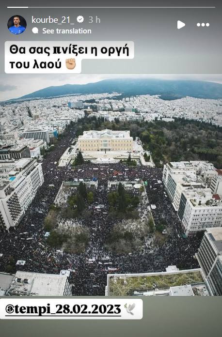 Θέση πήρε και ο πρώην αρχηγός του ποδοσφαιρικού Παναθηναϊκού και εν ενεργεία διεθνής, Δημήτρης Κουρμπέλης. Ο έμπειρος μέσος ανέβασε μία φωτογραφία από το Σύνταγμα και έγραψε… όλο το νόημα με λίγες λέξεις: «Θα σας πνίξει η οργή του λαού. Τέμπη 28.02.2023»
