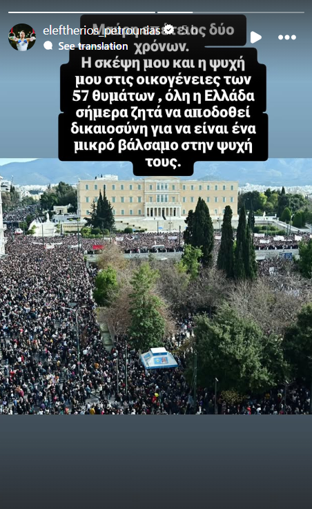 Δικαιοσύνη ζήτησε και ο θρυλικός Ελληνας Ολυμπιονίκης, Λευτέρης Πετρούνιας. Ο άρχοντας των κρίκων δημοσίευσε φωτογραφία από την Αθήνα και έγραψε: «Μαύρη επέτειος δύο χρόνων. Η σκέψη μου κι η ψυχή μου στις οικογένειες των 57 θυμάτων, όλη η Ελλάδα σήμερα ζητά να αποδοθεί δικαιοσύνη για να είναι ένα μικρό βάλσαμο στη ψυχή τους».