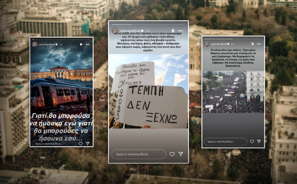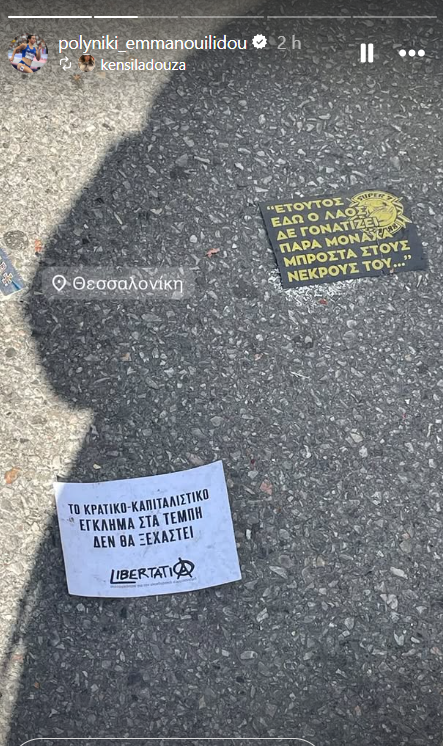 Θέση, και μάλιστα ξεκάθαρη, πήρε και η Πολυνίκη Εμμανουηλίδου. Η κορυφαία Ελληνίδα σπρίντερ ήταν παρούσα σε συγκέντρωση και δημοσίευσε μία σειρά από stories, καταδικάζοντας την αστυνομική βία και φωτογραφίζοντας χαρτάκια στα οποία αναγράφονται «Το κρατικό – καπιταλιστικό έγκλημα στα Τέμπη δε θα ξεχαστεί» και «Ετούτος ο λαός δε γονατίζει παρά μονάχα μπροστά στους νεκρούς του» (στίχοι του Γιάννη Ρίτσου).