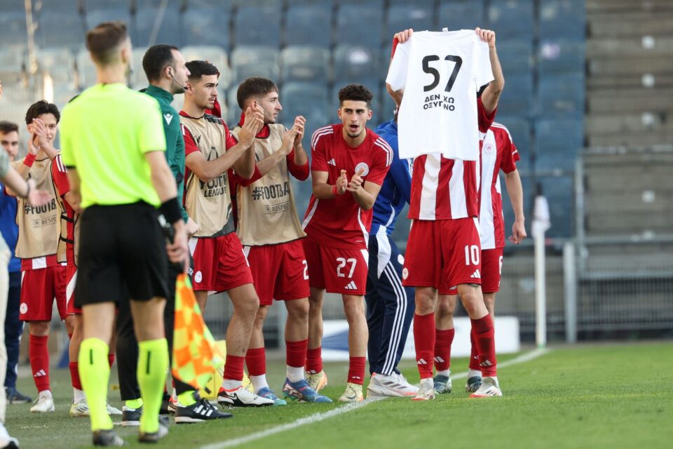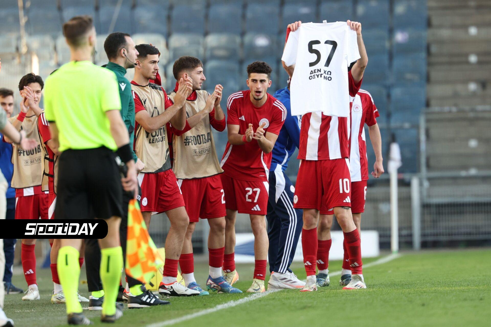 Ολυμπιακός Κ19: Συγκινητική στιγμή - Ο Παπακανέλλος σκοράρει και υψώνει φανέλα για τα 57 θύματα των Τεμπών