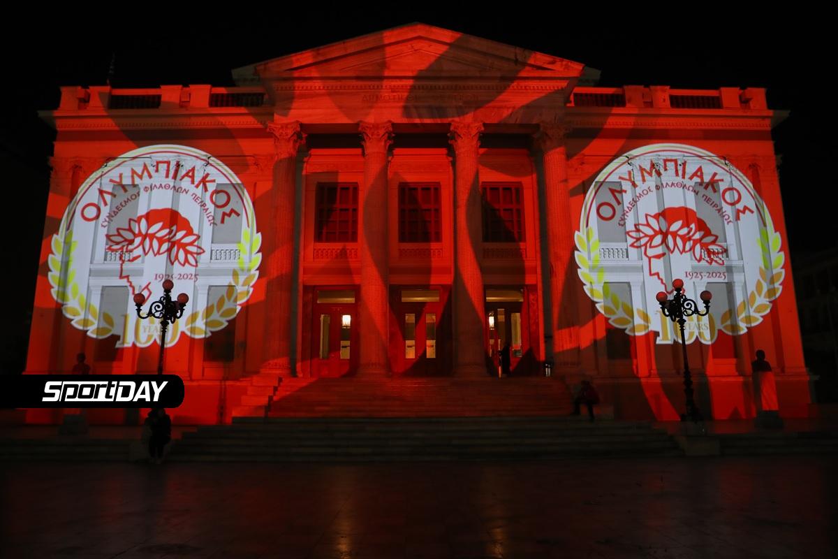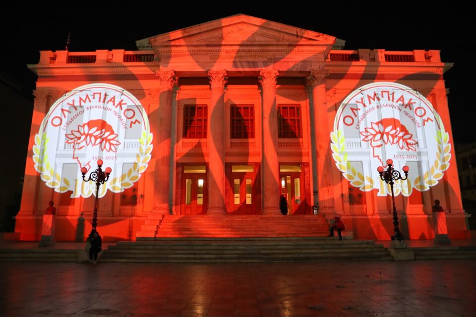 Ολυμπιακός: Φωταγωγήθηκε το Δημοτικό Θέατρο στον Πειραιά για τα 100 χρόνια