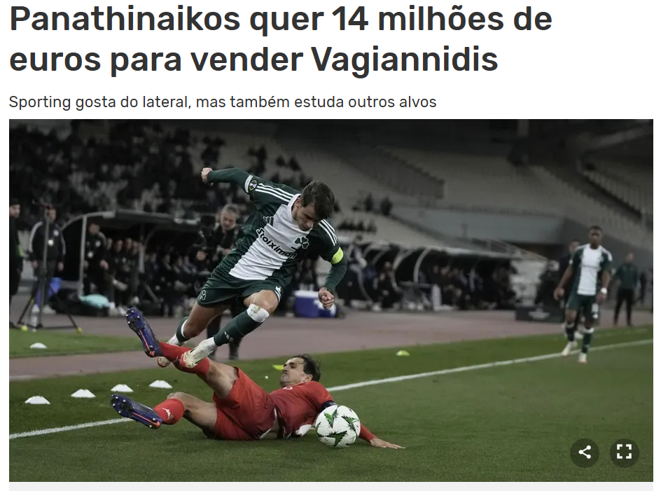 Μετά την «A Bola» που έγραψε για νέα πρόταση των «λιονταριών», ύψους 11 εκατ. ευρώ για τον διεθνή δεξιό μπακ του Παναθηναϊκού, σειρά πήρε η Record, που στην ιστοσελίδα της αναφέρει πως η Σπόρτινγκ, χωρίς να καταθέσει επίσημη προσφορά, έμαθε πως οι απαιτήσεις του Παναθηναϊκού αγγίζουν τα 14 εκατ. ευρώ. Αναφέρει μάλιστα πως πρέπει να καταβληθούν 11 εκατ. ευρώ και άλλα 3 εκατ. ευρώ σε περίπτωση επίτευξης πριμ στόχων, που όμως είναι εφικτά.