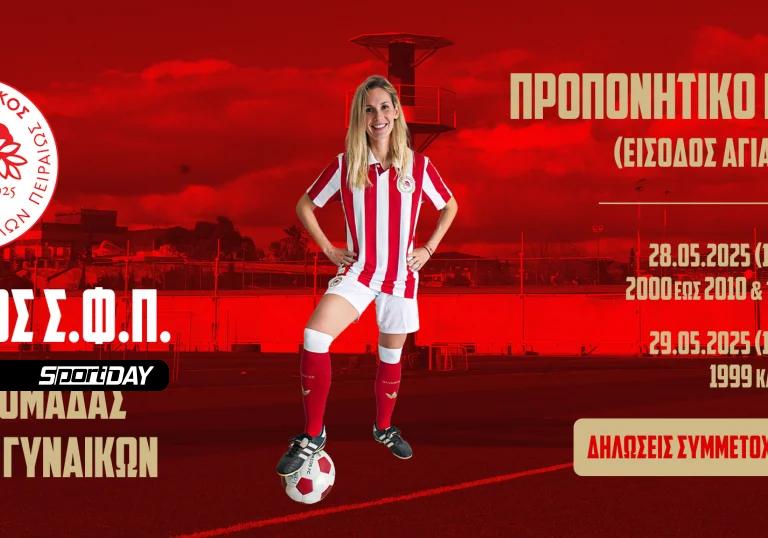 «Ο ΟΛΥΜΠΙΑΚΟΣ Σ.Φ.Π. ανακοινώνει τη διεξαγωγή Open Trials (ανοιχτών δοκιμαστικών) για την ομάδα ποδοσφαίρου Γυναικών. Τα «ερυθρόλευκα» δοκιμαστικά θα πραγματοποιηθούν στο Προπονητικό Κέντρο του Ρέντη, το διήμερο 28-29/5.