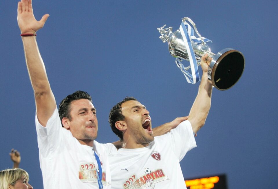 Ο Νίκος Νταμπίζας σηκώνει το τρόπαιο έχοντας δίπλα του τον έμπειρο συμπαίκτη του, Ζήση Ζιάγκα, ο οποίος ήταν αρχηγός της ΑΕΛ τα χρόνια που αγωνιζόταν στις χαμηλότερες κατηγορίες.