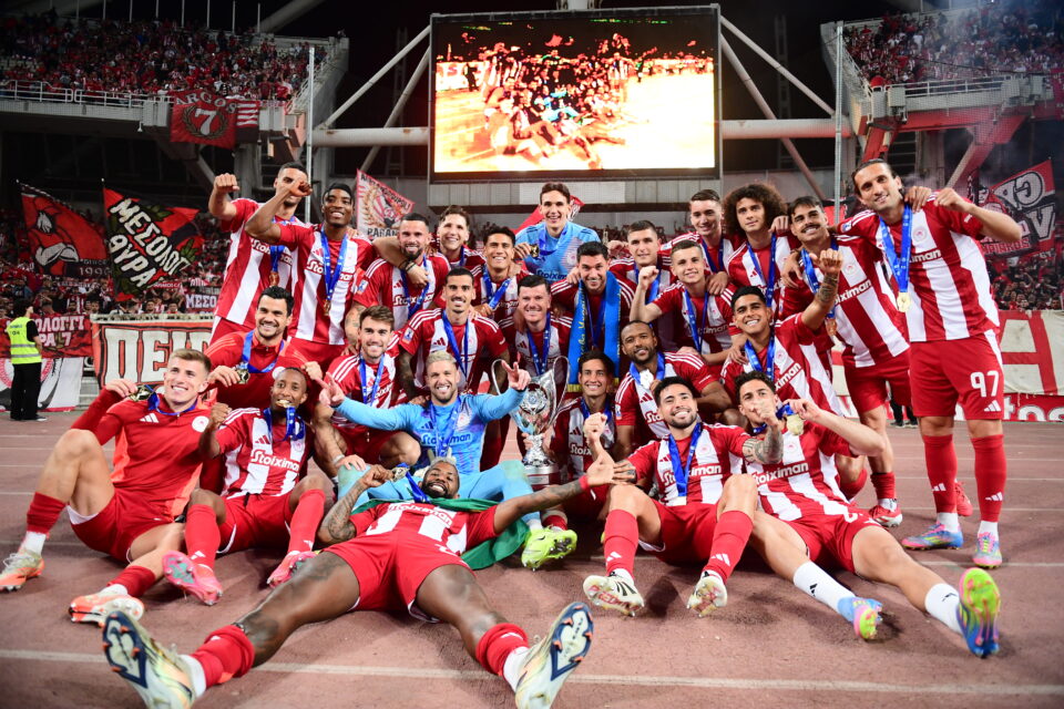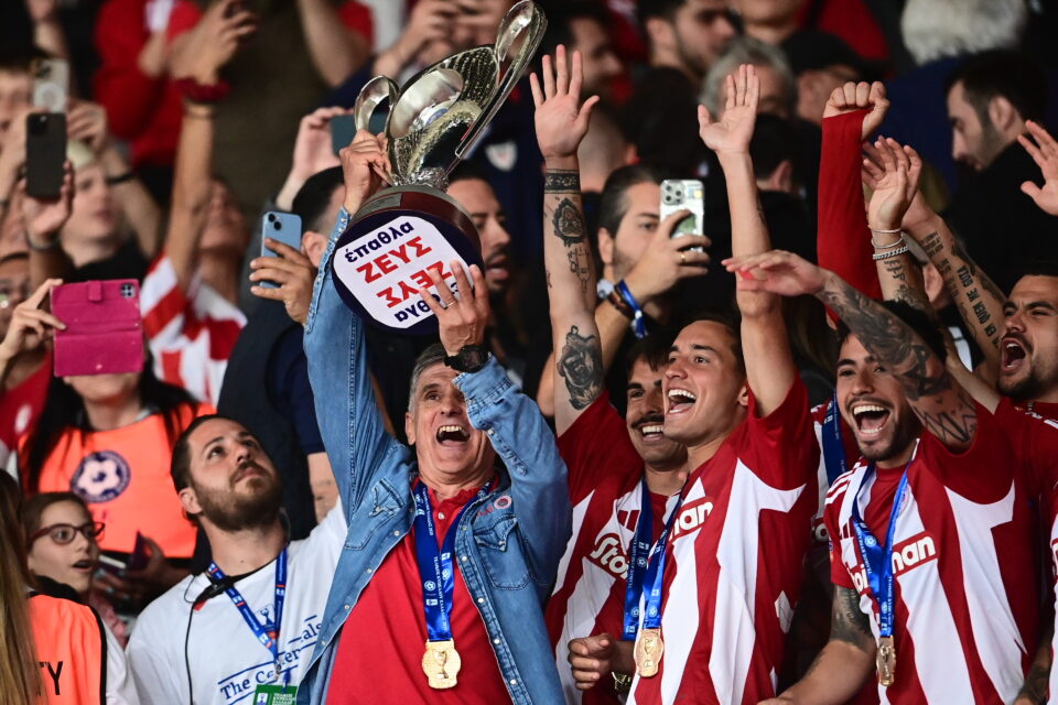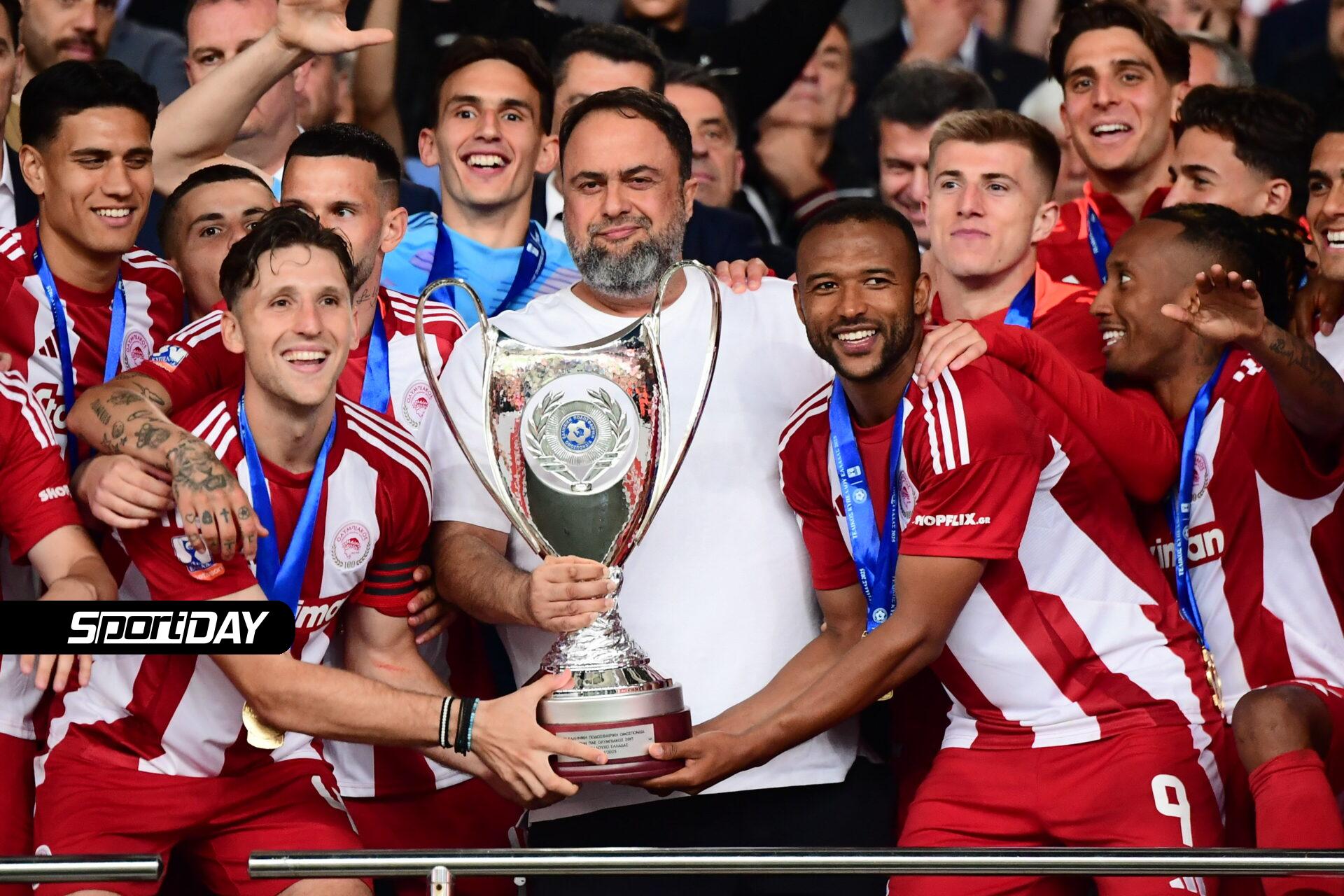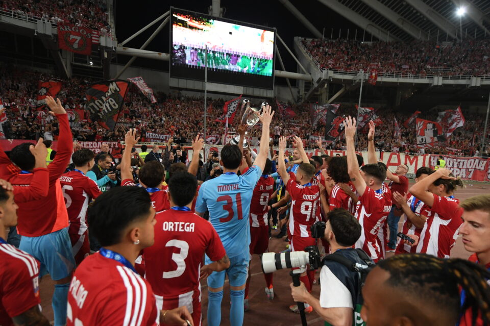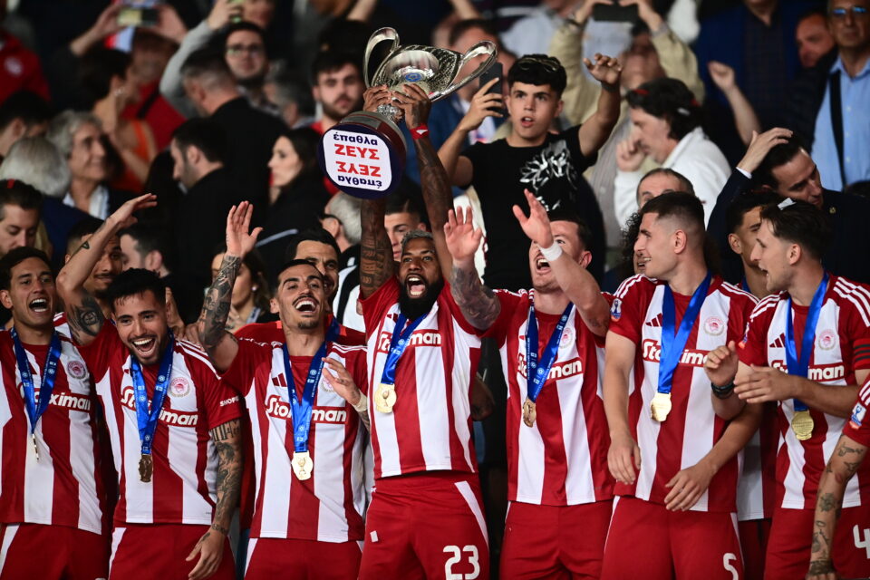 Ο Ολυμπιακός πανηγυρίζει το νταμπλ, με το κύπελλο να φτάνει στα χέρια των «ερυθρόλευκων»