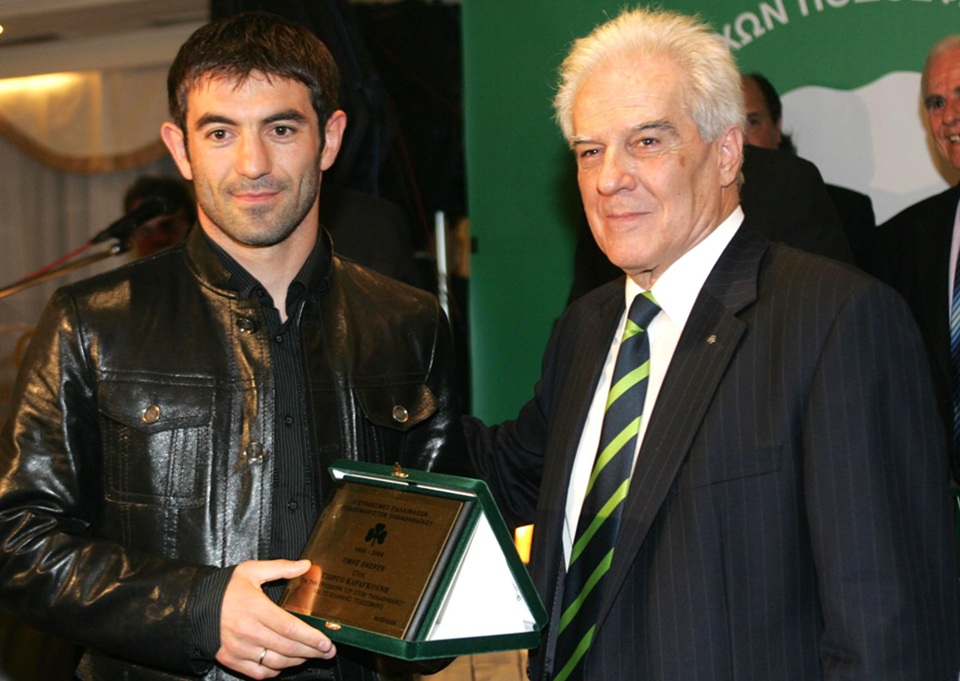 Ο Βαγγέλης Πανάκης βραβεύει τον Γιώργο Καραγκούνη, σε εκδήλωση του Συνδέσμου Παλαιμάχων Παναθηναϊκού το 2008.