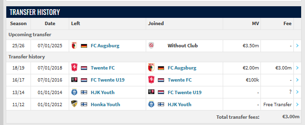 Συνολικά έχει 111 συμμετοχές με 9 γκολ και 12 ασίστ στην Αουγκσμπουργκ, ενώ μετράει και 60 συμμετοχές με την Τβέντε στο Ολλανδικό πρωτάθλημα, με 9 γκολ και 7 ασίστ.