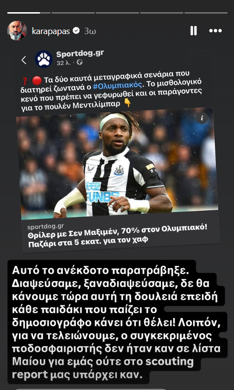 Μέσω ανάρτησης στο Instagram, ο Κώστας Καραπαπάς διέψευσε τα δημοσιεύματα που ήθελαν τον Ολυμπιακό να διαπραγματεύεται με τον Αλάν Σεν-Μαξιμέν, ξεκαθαρίζοντας ότι ο παίκτης δεν βρίσκεται καν στη λίστα της ομάδας.